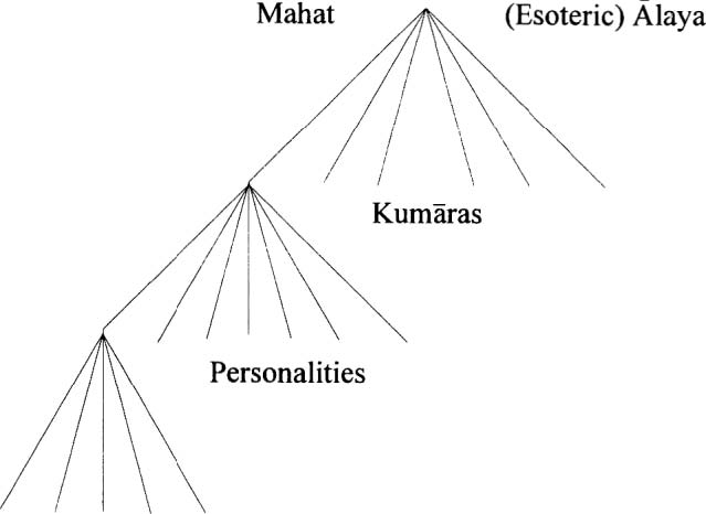 The Ray can be manifested on this earth because it can send forth its Māyāvi- Rūpa. But the higher cannot, so it has to send forth a Ray. We may look upon the Higher Ego as the Sun, and the personal Manases as its Rays. If we take away the surrounding air and light, the Ray may be said to return to the Sun, so with the Lower Manas and Lower Quaternary.