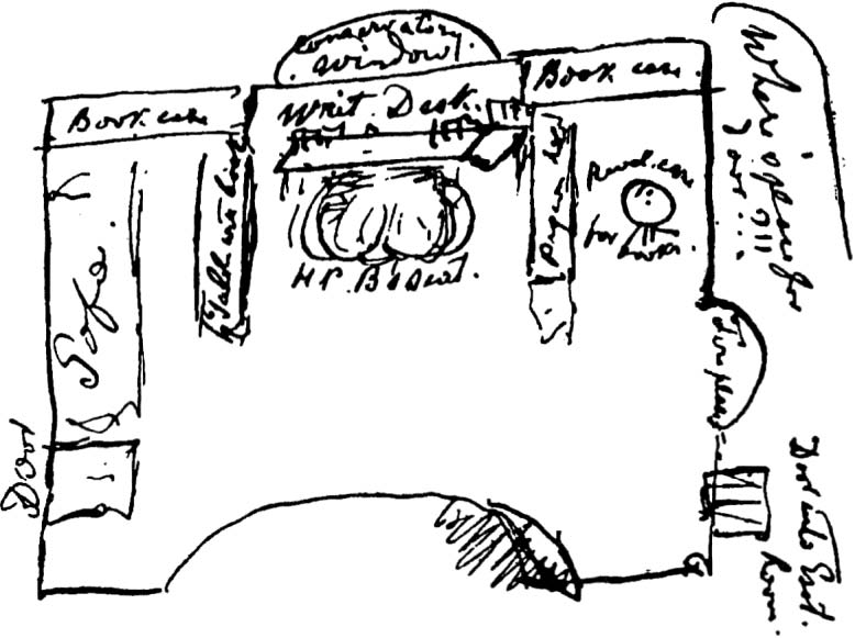 Do not accuse your old “occult nurse” of not knowing her mind, but I have dreamed of a dreadful thing. I saw that if a door from my study was opened into the esoteric working room on the right side of the fire place—i.e., toward, and on the right side of my desk it wil cram me utterly preventing me to place my pigeon hole on my right side and leaving no room to move. So 1 have called forth the picture of the future before me and see that the only way of making things comfortable was to open it (the door) on the left side, there, where I wanted to place may large press for dresses, (the 20 gui[nea] one.)