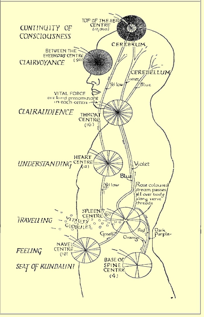 Briefly, we shall find that the Etheric Double, while necessary to the life of the physical body, is not, properly speaking, a separate vehicle of consciousness: that it receives and distributes the vital force which emanates from the sun and is thus intimately connected with physical health: that it possesses certain Chakrams or Force-Centres of its own, each with its distinct function: that upon the action of etheric matter mainly depends the memory of the dream life: that it plays an important part in determining the kind of physical vehicle which an incarnating ego will receive: that, like the physical body, it dies and decays in due course, releasing the “soul” for the next stage in its cyclic journey: that it is especially associated with what is known as Vital or Magnetic Healing, and also with Mesmerism, whether for purposes of healing, anæsthesia, or trance: that it is the principal factor concerned in séance-room phenomena, such as the movement of objects, production of “raps” and other sounds, and materialisations of all kinds: that the development of etheric faculties confers new powers and reveals many etheric phenomena, which are beyond the experience of most men: that by the use of the matter of the etheric body objects may be “magnetised”, much as living beings may be mesmerised: and, finally, that the etheric body provides the material out of which the substance known as ectoplasm is formed.