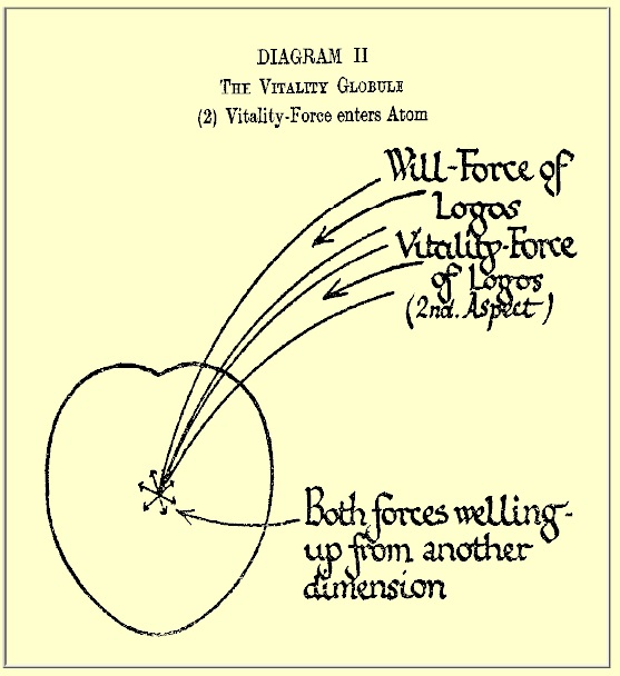 There are thus two forces which enter the atom from within: (1) the Will-force of the Logos, which holds the atom together in its proper shape; (2) the Prânic force. It is important to note that Prâna comes from the Second Aspect of the Solar deity, whereas the Will-force emanates from the Third Aspect The effect of Prâna on atoms is entirely different from that of electricity, light, heat or other expressions of Fohat. Electricity, rushing through the atoms, deflects them and holds them in a certain way, and also imparts to them a separate and distinct vibration-rate. Any of the variants of Fohat, such as electricity, light, or heat, cause an oscillation of the atom as a whole, an oscillation the size of which is enormous as compared with that of the atom itself, these forces of course acting on the atom from without.