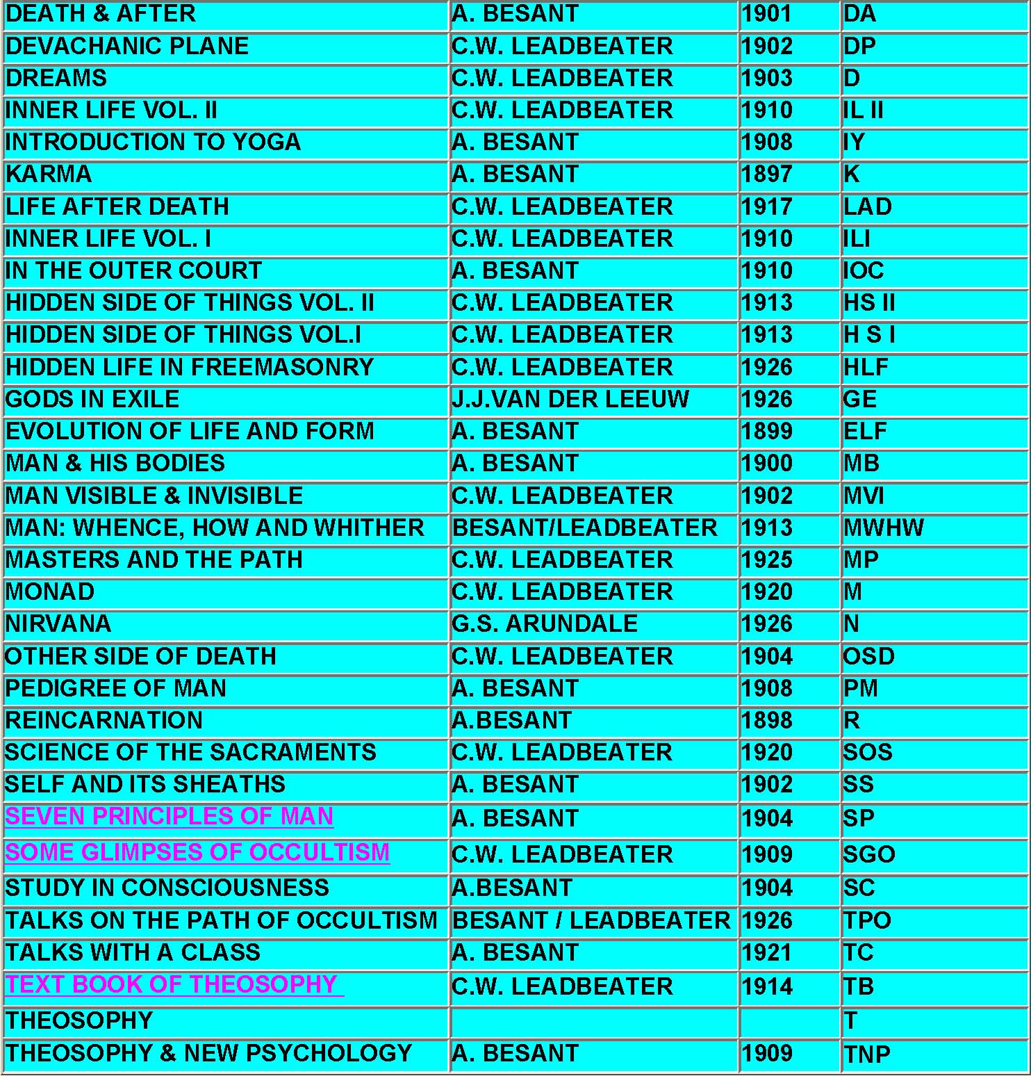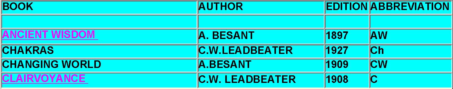 In addition, there has been incorporated a considerable amount of information regarding the planes, or worlds, associated with these four bodies of man. It is therefore, probably near the truth to say that the gist of nearly everything that has been published by the two principle pioneers into the mysteries and complexities of the Ancient Wisdom, with the exception of certain clearly marked specialities [such as Occult Chemistry, for example] is to be found in these four books.