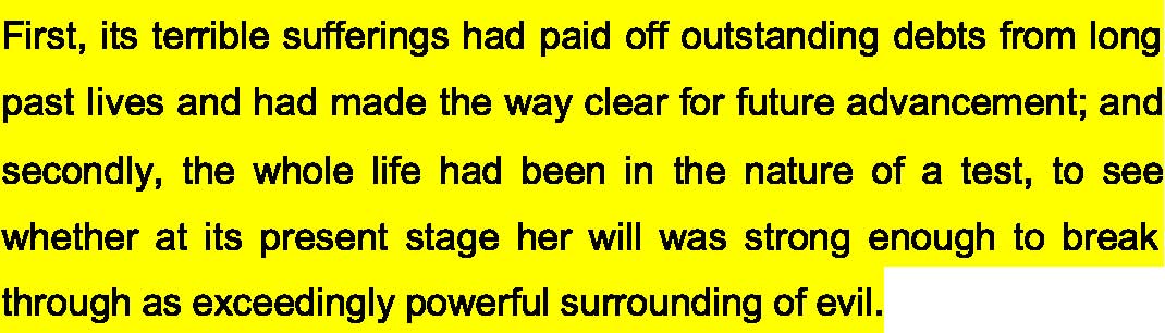 Soon after this the old farmer Irene, for whom they had originally begun to work, passed over to the astral plane, leaving them in return for their years of loyal service nearly the whole of his estate, with the exception of certain small portions already promised to some distant relations. Thus the family became definitely established as local magnates, and their future welfare was assured. There house also became a kind of religious centre, since it was recognised that the philosophical information which they had to give formed a valuable supplement to the ordianary teaching of the Nature-worship which surrounded them. Alcyone’ s husband Neptune and her brother Uranus both died before her, but though she mourned over the separation from them her children still remained to her, as did also her position of great respect and honour in the district. She passed away peacefully at the age of ninety-one.