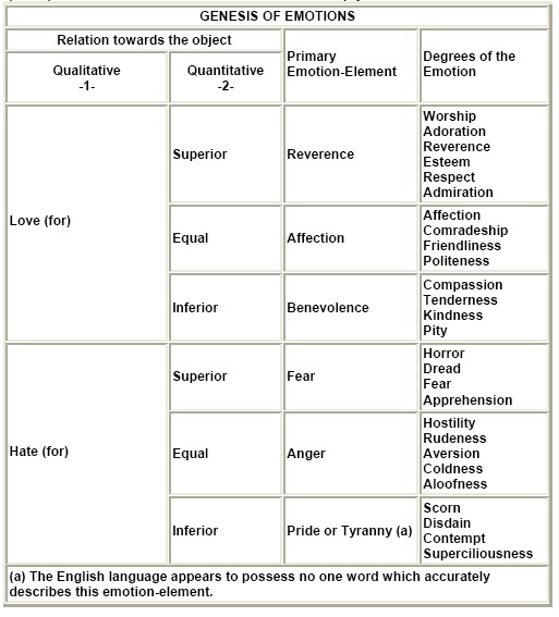power gained in one helping to some extent in the training of the other two. We have already seen (page 64) the desirability of purifying the physical body, by means of food, drink, hygiene, etc., in order to make slightly less difficult the control of the astral body. The same principle applies with even greater force to the mental body, for it is in the last analysis only by the use of mind and will that the desires, emotions and passions of the astral body can be brought into perfect subjection. For many temperaments, at least, a careful study of the psychology of emotion is of very great assistance, as it is clearly much easier to bring under control a force the genesis and nature of which is thoroughly understood. For this purpose, the present writer very strongly recommends a thorough study of the principles laid [Page 216] down in that masterly treatise The Science of the Emotions, by Bhagavan Das. (An admirable epitome of this work has been written by Miss K. Browning, M.A., under the title An Epitome of the Science of the Emotions.) The main thesis may be very briefly set out as follows. All manifested existence may be analysed into the Self, the Not-Self, and the Relationship between these two. That Relationship may be divided into (1) Cognition (Gnyânam): (2) Desire (Ichchâ): (3) Action (Kriyâ). To know, to desire, and to endeavour or act — those three comprise the whole of conscious life. Feeling or emotion is of two kinds — pleasurable or painful. Pleasure, fundamentally a sense of moreness, produces attraction, love (ragâ): pain, fundamentally a sense of lessness, produces repulsion, hate (dvesha). From attraction proceed all love-emotions: from repulsion proceed all hate-emotions. All emotions arise from love or hate, or from both, in varying degrees of intensity. The precise nature of a particular emotion is also determined by the relationship between the one who experiences the emotion and the object which is the occasion of the emotion. The one who experiences the emotion may be, so far as the circumstances connected with the particular emotion are concerned, (1) Greater than: (2) Equal to: or (3) Less than the object. Pursuing this analysis, we arrive at the six possible types of emotion-elements given in column three of the table appended. Column four gives sub-divisions of the primary elements in varying degrees of intensity, the strongest being at the head and the weakest at the foot of each group. All human emotions consist of one of these six emotion-elements, or, more frequently, of two or more of them combined together. The student must now be referred to the treatise mentioned above for a detailed elaboration of the fundamental principles set forth above. His labour will be amply rewarded.[Page 217]