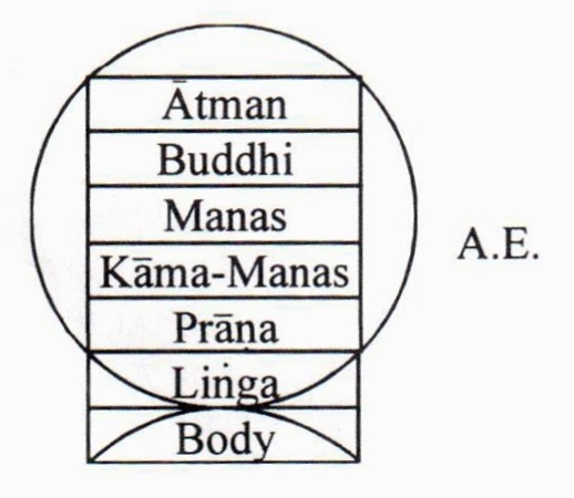 Here H.P.B. drew two diagrams, illustrating different ways of representing the human principles. In the first:- the two lower are disregarded, they go out, disintegrate, are of no account. Remain five, under the radiation of Atman.