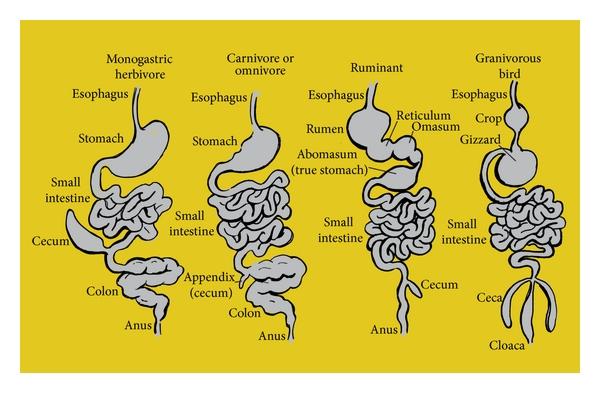(Loài thú có thói quen ăn thịt có đường tiêu hóa chỉ dài gấp 3 lần chiều dài của cơ thể. Trong khi đó đường tiêu hóa của loài người và loài động vật ăn rau quả thì dài gấp 12 lần chiều dài của thân thể. Vì thế chất cặn bã ở trong ruột của loài thú ăn thịt sẽ được bài tiết ra ngoài nhanh chóng hơn. Trong khi đó chúng sẽ ở lại trong ruột của loài người và loài động vật ăn thảo mộc lâu hơn. Chính vì thế mà chúng có cơ hội sanh ra độc tố nhiều hơn. Trích bài của BS Bùi Đắc Hùm)